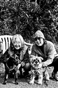 *すっかり青山の『モダンおばさん』から普通の『田舎のおばあちゃん』と化したわたくしの母上!洋子ママと、ふたりの娘たち!!リズちゃん...まだ1歳の『か弱き乙女』なはずなのに、なんか雄の闘犬みたいじゃない???同じ犬種に見えませんな。。。