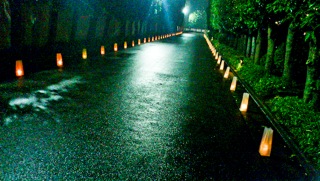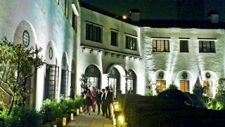 ホテルオークラ前の正門での厳しいセキュリティーチェックを無事通り抜けた後、両サイドを灯籠でライトアップされた小雨の降る幻想的な長い道をずんずん進んで行くと...現れました!大使公邸!!