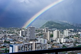 夕方あたりにちょっとシャワーが降るだけで、自宅のラナイのこんなに近くにこんなにもくっきりレインボーが...そして遠くにちょっぴりですけどサンセット......まさにRealDream.World。。。(嬉)