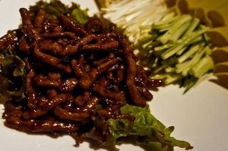 オススメの『豚肉の細切り味噌炒め』はキュウリやネギと一緒に珍しいクレープ風の薄高野豆腐に巻いて食すヘルシーな一品!どの料理も上海風であっさりなんで嬉しい限りであります。。。