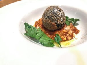 「イカ墨のアランチーニ雲丹トマトソース」、