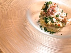 「炙りズワイガニとホタテ、彩り野菜のクスクスサラダ」、