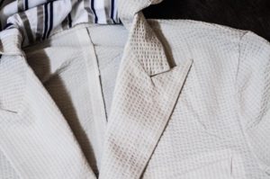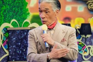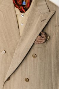 9月29日ON AIRということで、本来 衣装は普通のタレントさんだとバキバキのA/Wでイクところなんですが、巨匠はその収録時のリアルはものでないと(暑いよ〜と)嫌がるもので、スーツはS/SともA/Wとも言い切れない、3シーズンいける 細かいヘリンボーン柄の『TAGLIATORE』ベージュダブルスーツにして