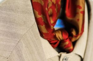 インナーは『Blu Bre』のベージュ ロングスリーブ ニットシャツ +『Vandori』の新作でボルドー×ゴールド千鳥チェック柄 シルクスカーフ、