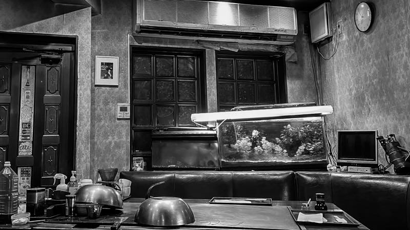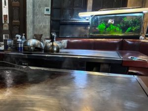 一歩店内に入ると、巨大な鉄板焼きプレートが設置されたベンチシートが2席のみの、こじんまりとしながらもゆとりさも備えた昭和感溢れるインテリアと、一瞬「鯉」かと見間違うほどの巨大な金魚が二匹泳ぎ回る水槽が目に飛び込んできます。