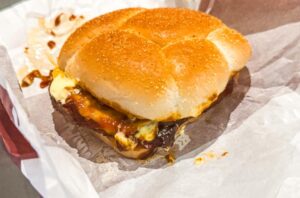 中身はつなぎを使用していない100%ビーフパティにコクのあるチェダーチーズ、ソテーしたビーフとオニオンとマスタードソース…そこに味の決め手となるバーベキューソースが絡み合うわけですから、そりゃジューシーでコクもあり 美味いに決まってますよね〜🍔。