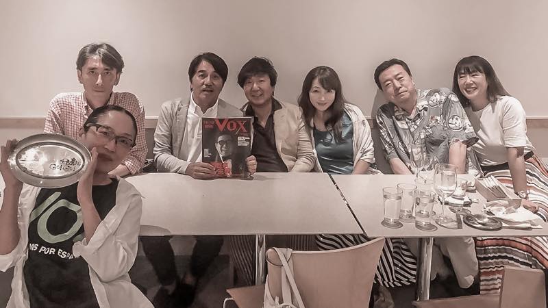 当時学生のアルバイトで活躍していた、今やなんと40本の連載を抱える超売れっ子ライター前川亜紀嬢(写真一番左で「GO!GO! 大西豊さん」と書かれたプレートを持ちながら 謎の『VOX 』Tシャツを着ているおじさんのような女史…笑。)が幹事として仕切ってくれた、今回のこの話題のPiiza店のスペシャルメニューは