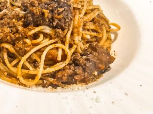 そしてこの日のメインは、リッチー自慢の「黒毛和牛のラグースパゲッティ」…となると呑兵衛な二人ですから、案の定1本では飲み足らず😅