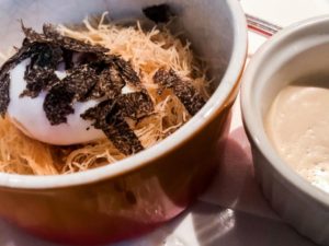 温泉卵みたいな烏骨鶏の卵と パリパリの食感の、これなんだろうなぁ?極細のパスタ?みたいなものとトリュフ、さらにそこに甘めなリキュールの入った謎のクリームソースを混ぜ混ぜしていただく不思議な食べ物(笑)から