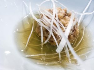 あられをまぶした「魚のつみれ煮」や