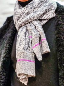 なんと表面がジャガードのようで 実はプリントという騙し絵的な仕掛けがされており、両先にはニットの袖元のようなリブまでついた実に凝ったデザインに一目惚れ…この日は『株式会社インテレプレ』に行くということもあり、僕にとっては珍しく全身ブラックのスタイルだったのでグレー地にピンクのラインが入ったものを巻いてみましたが、